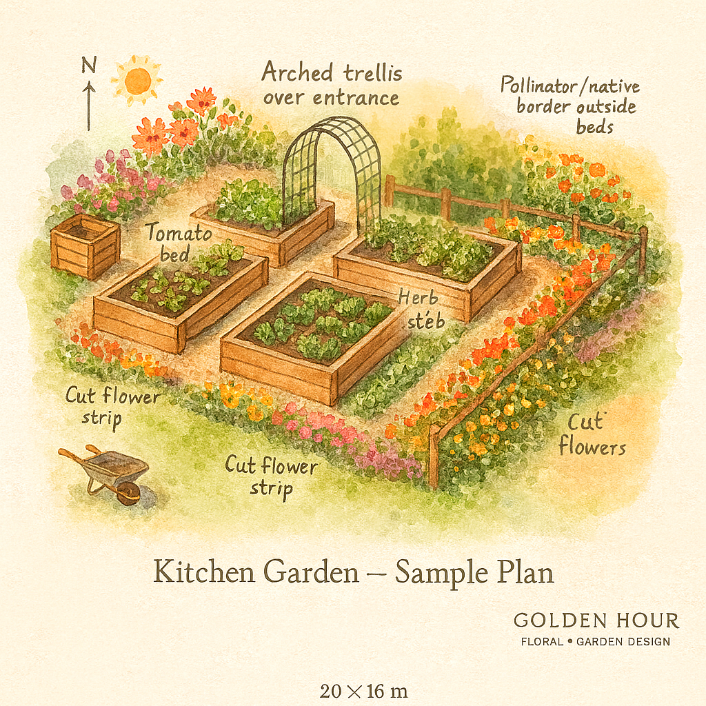 We start with an hour-long consultation in your space, walking through your yard, sun patterns, and style. You’ll get a custom kitchen garden design tailored to your space, lifestyle, and taste—down to the raised bed layout, plant pairings, and seasonal harvest plan.